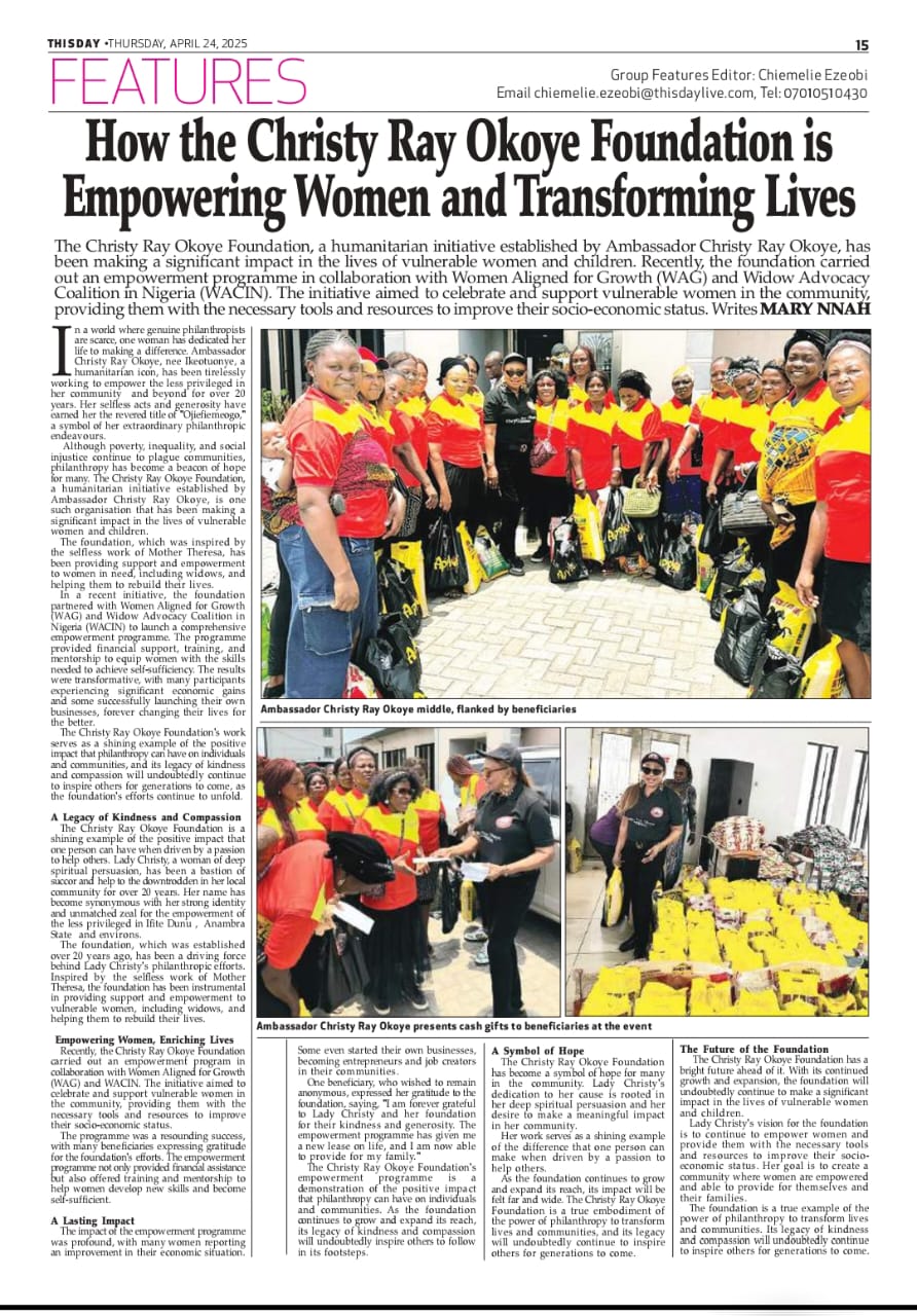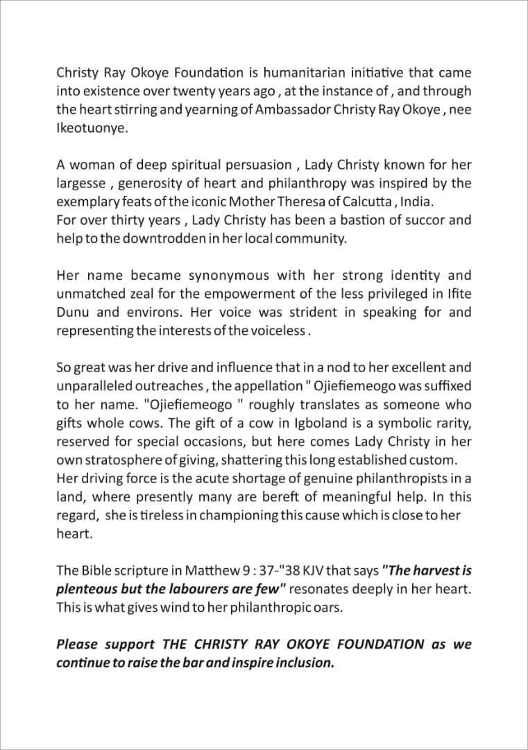 hrough its unwavering commitment to service, the Christy Ray Okoye Foundation continues to transform lives, embodying the principle that one does not have to be wealthy to make a significant impact. As Lady Christy herself asserts, “You don’t have to be rich to make an impact” .thesun.ng